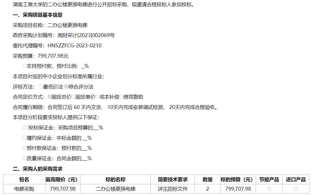 湖南工商大学二办公楼更换电梯项目公开招标公告