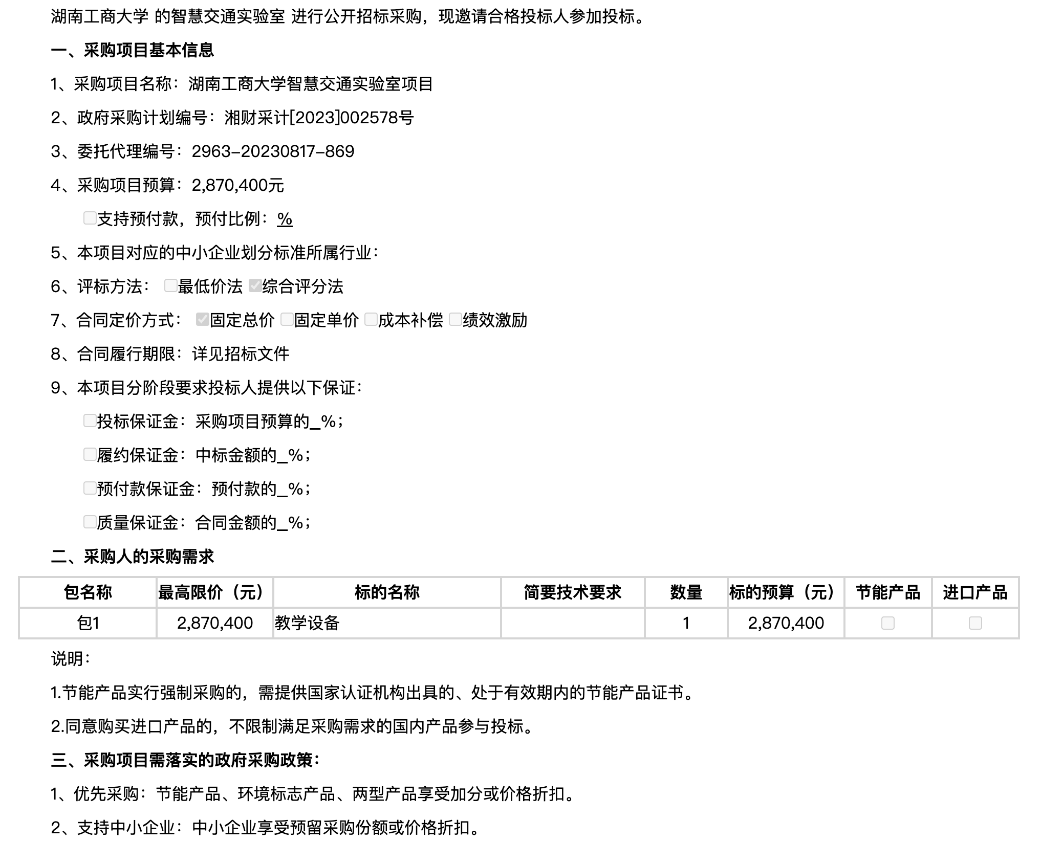 湖南工商大学智慧交通实验室 项目公开招标公告