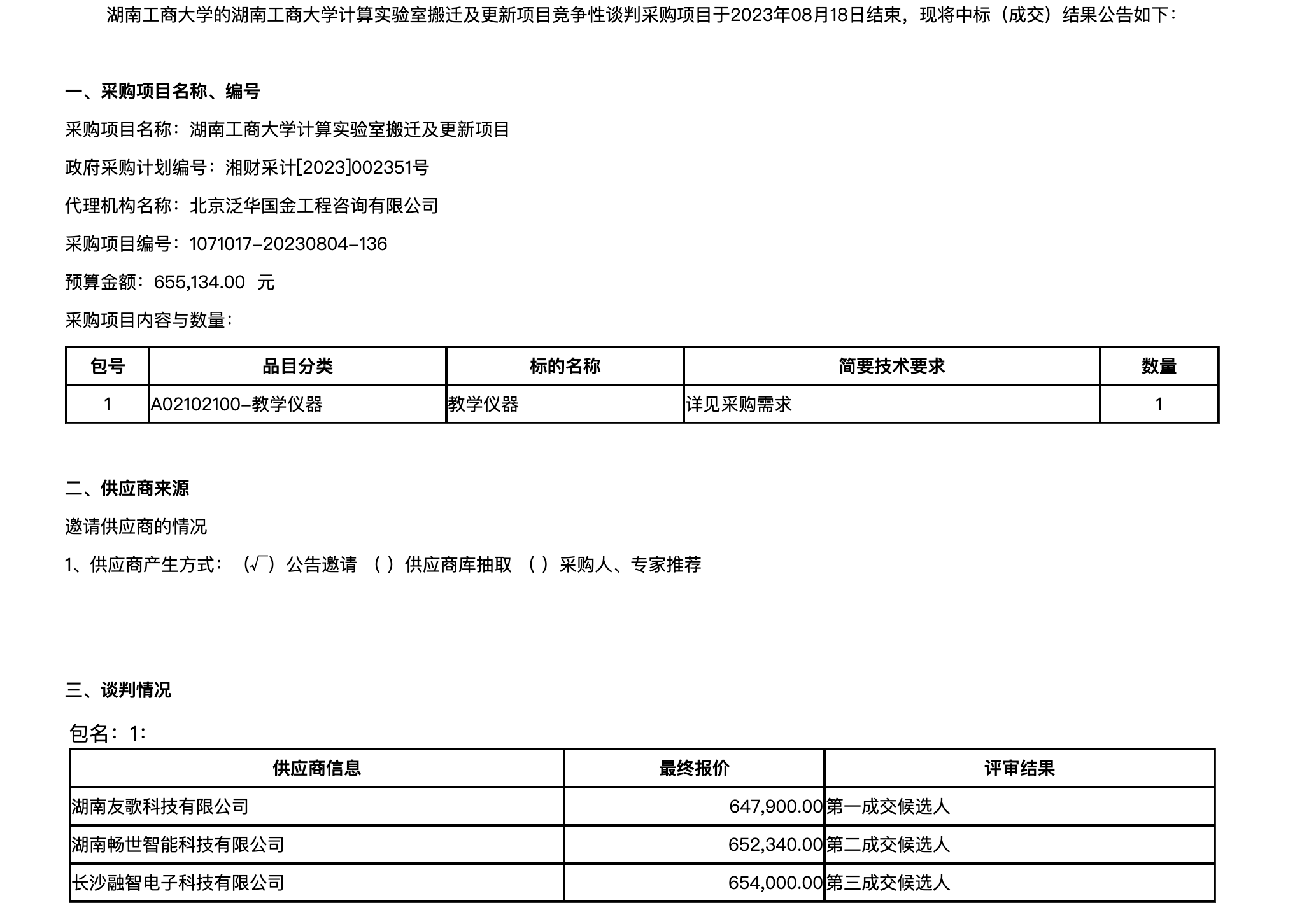 湖南工商大学计算实验室搬迁及更新中标(成交)公告