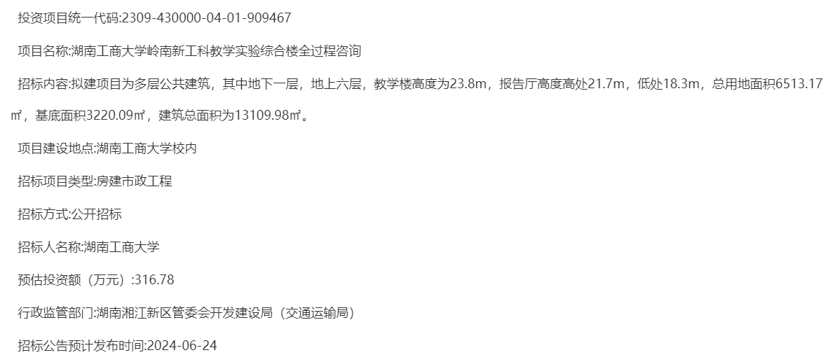 湖南工商大学岭南新工科教学实验综合楼全过程咨询招标计划