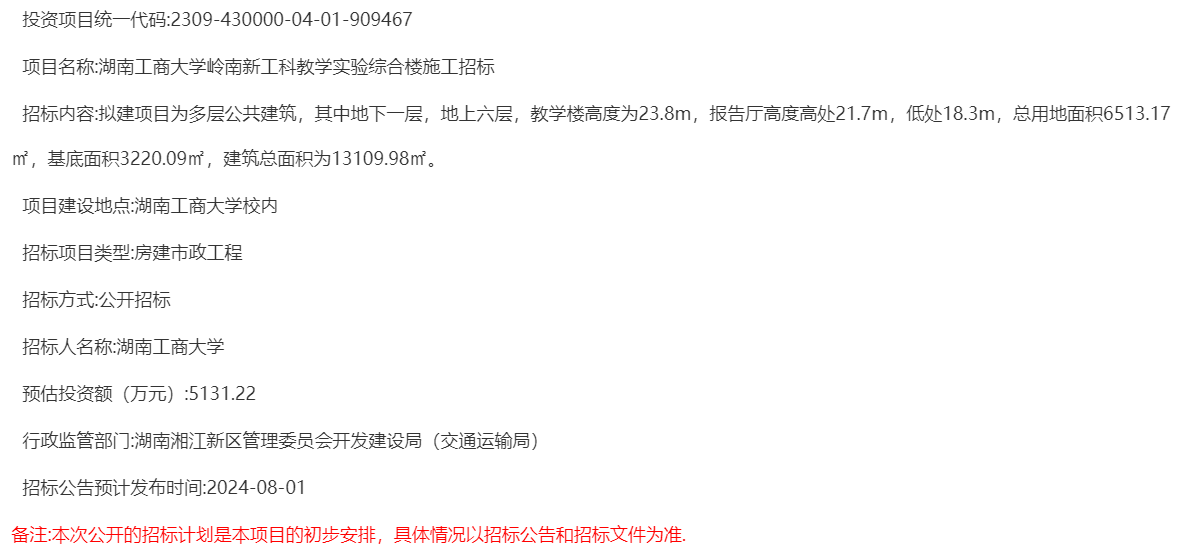 湖南工商大学岭南新工科教学实验综合楼施工招标招标计划