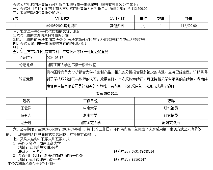 湖南工商大学机构国际竞争力分析报告单一来源采购公示