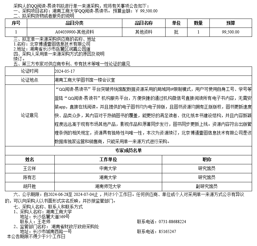 湖南工商大学QQ阅读-易读书单一来源采购公示