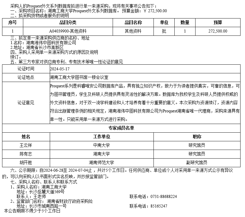 湖南工商大学Proquest外文系列数据库单一来源采购公示