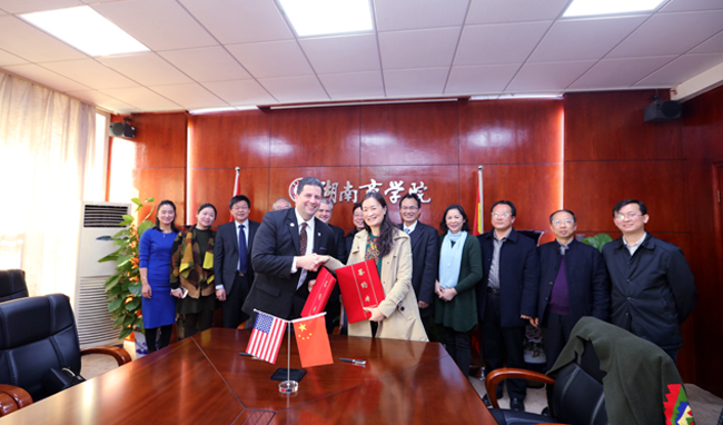 12月29日,美国尼亚加拉大学(Niagara University)校长詹姆斯·J·马希尔(James J. Maher)、副校长凯文·G·克瑞(Kevin G. Creagh)、商学院院长李天宝等一行4人来我校洽谈中外合作办学金融硕士专业相关事宜。我校校长陈晓红,副校长王明高、曾伏秋、黎定军会见来宾并举行了签字仪式,签署了《中国湖南商学院与美国尼亚加拉大学合作举办金融学专业高等教育硕士项目协议书》。签字仪式由副校长黎定军主持。