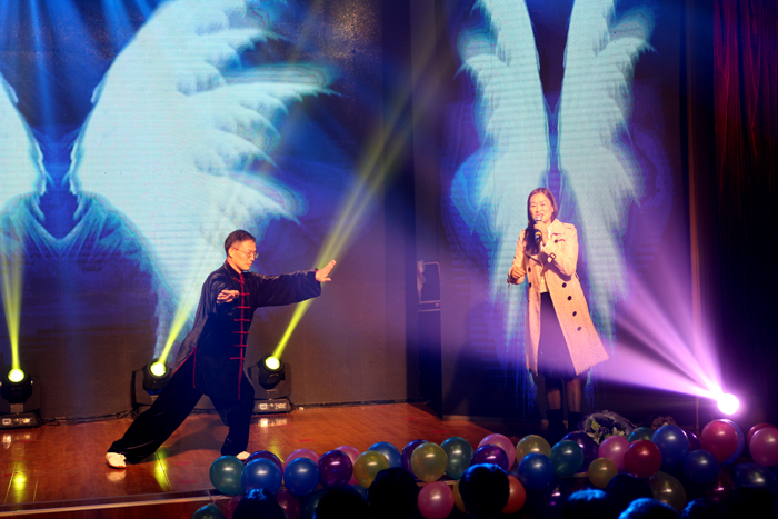 校党委书记唐亚阳与校长陈晓红同台表演。太极舒展大方,刚柔相济,歌唱清亮优美,寓意深长,现场气氛瞬间被引爆。