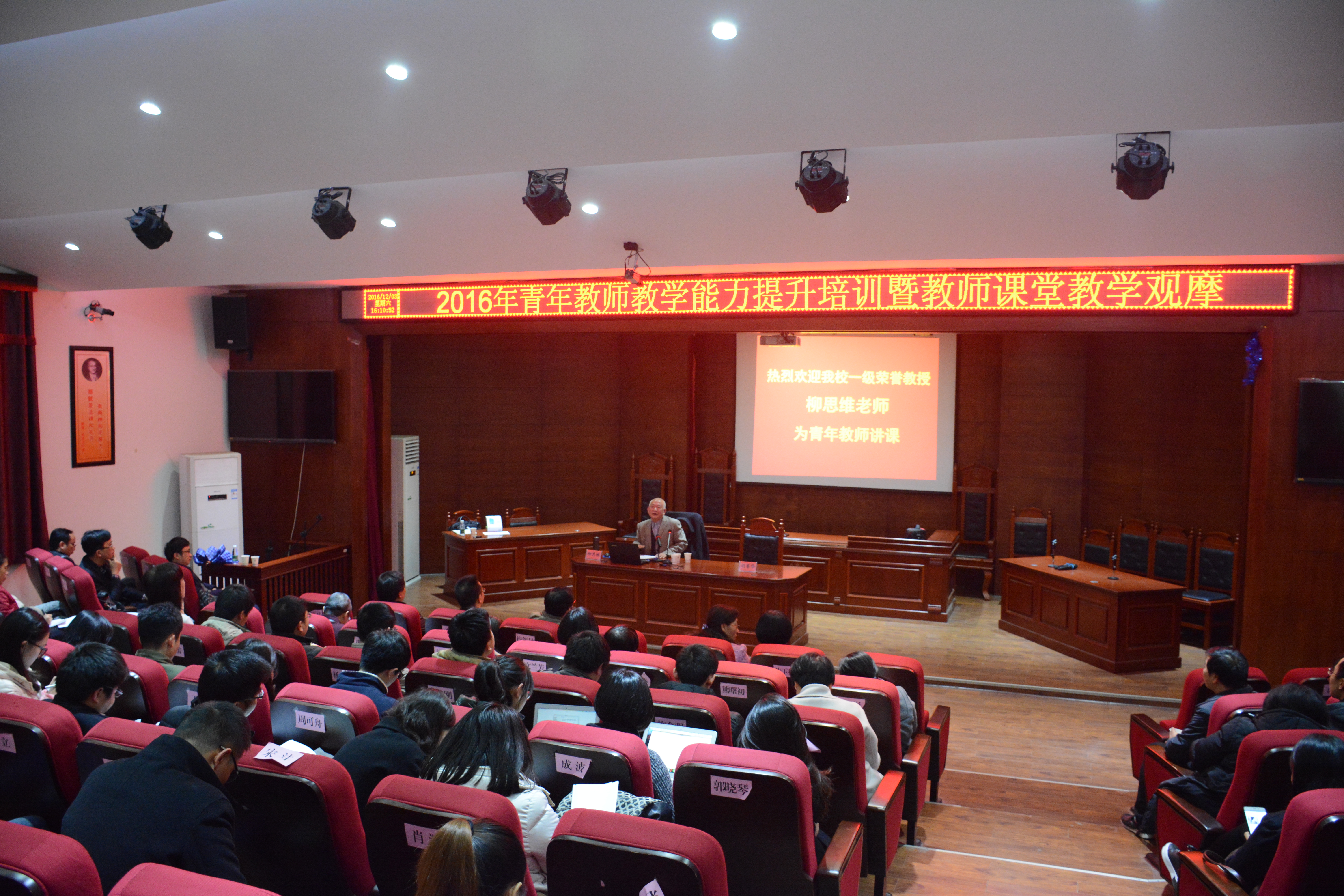 柳思维教授以“大学教师的师德师风建设”为主题,结合自己丰富的人生阅历,强调了新形势下师德师风建设的重要性,提出了目前大学教师在师德师风建设中存在的不足,以及教师如何坚持把立德树人作为教育教学的中心环节,在教学过程中育人,努力塑造学生的崇高人格,并对在场的青年教师提出了殷殷期盼。