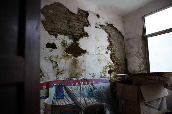 12:20,工作队和村支书石中秋来到村部,商量村部改建报批事宜。图为村部二楼办公室,因2014年5月25日特大山洪袭击,承重墙开裂变形。