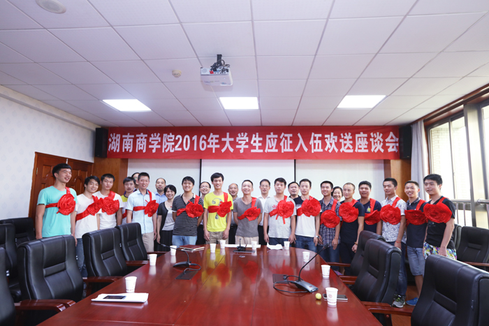 9月13日下午,二办401会议室里传出阵阵掌声,我校2016年大学生应征入伍欢送座谈会在此举行。校党委书记唐亚阳为到场的17名应征入伍学生佩戴红花,副校长曾伏秋出席会议。会议由我校武装部部长、学工处处长张贵华主持。
