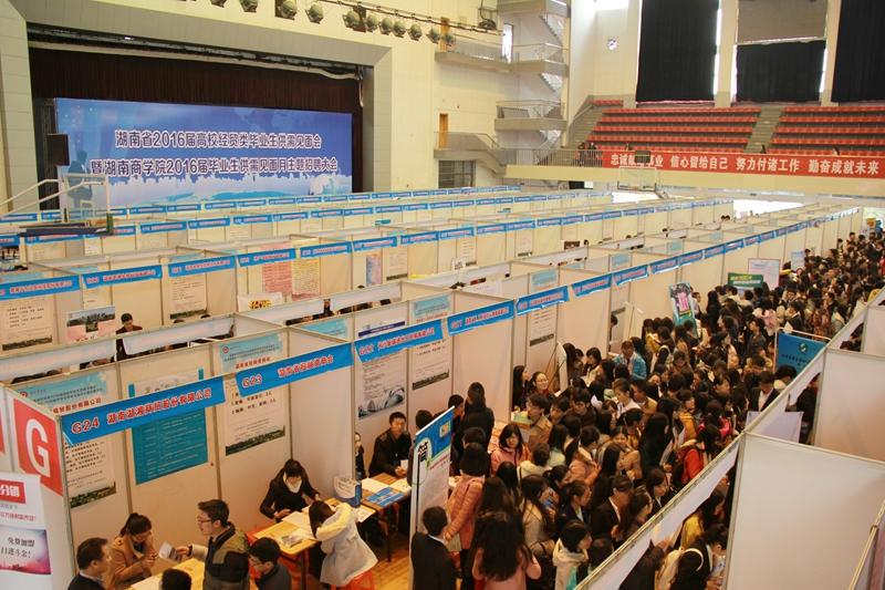 招聘会上,招商银行、中国民生银行、家乐福、苏宁云商等228家企业进场招聘,提供工作岗位6000余个,为毕业生提供了广阔的选择空间,其中,有四分之一是上市公司、国有企业和业内知名企业。来自我校、湖南科技大学、湖南财政经济学院、湖南涉外经济学院、湖南信息职业技术学院、湖南商务职业技术学院等共计5000余人进场应聘 。现场人潮涌动、气氛热烈。许多低年级的学子也前来“观望”,制定自己的大学规划,积累求职经验,寻找实习机会,为将来顺利就业做好准备。