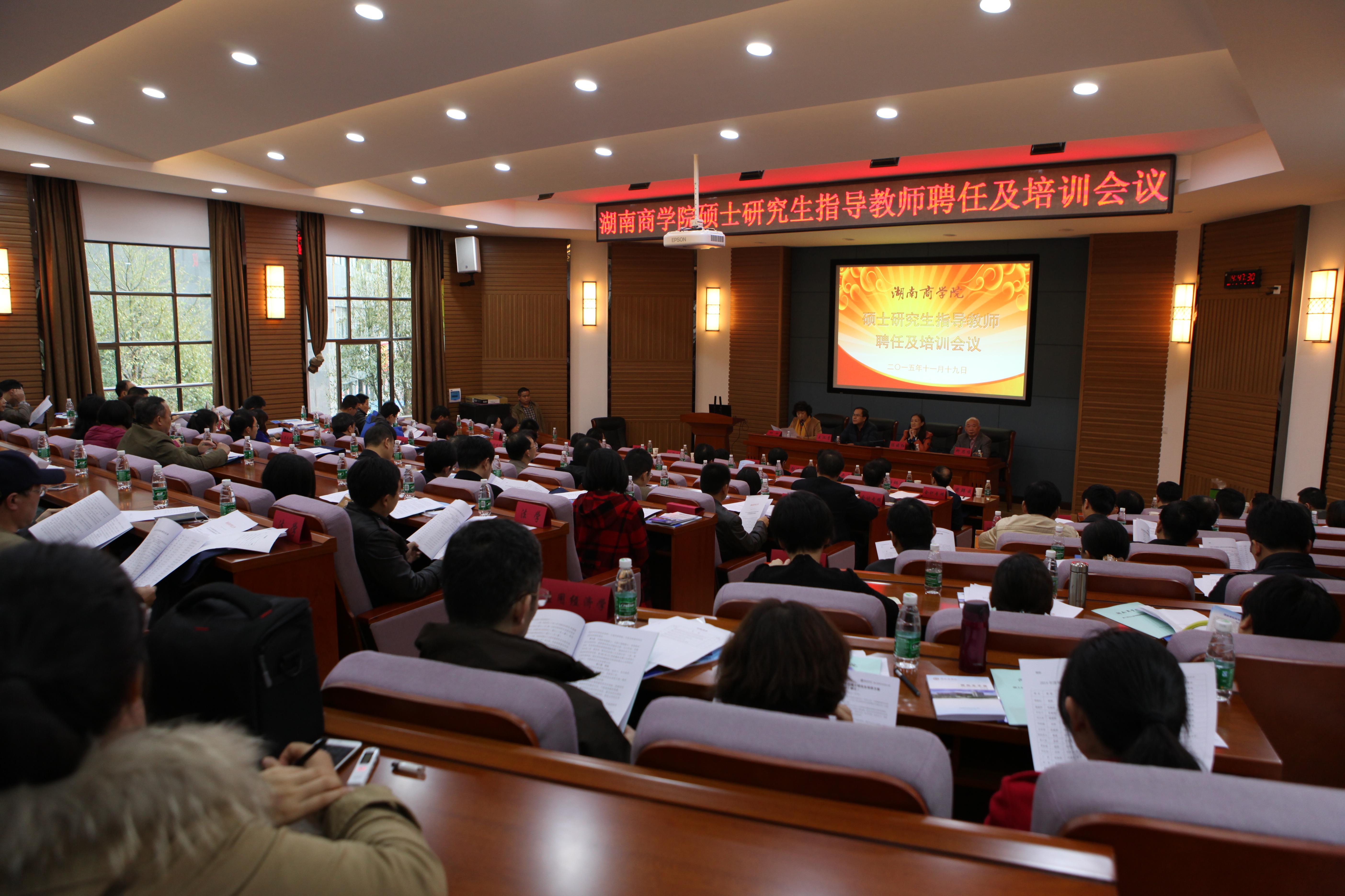 11月19日下午,我校2014年、2015年新聘硕士研究生指导教师聘任暨培训会在乐知楼F201报告厅举行。校党委书记王汉青教授、校长陈晓红教授、副校长彭进清教授、校纪委书记陈丽影教授、校领导杨虹教授、校学术委员会主任柳思维教授出席会议,各学位点负责人,各培养单位主要负责人、分管院领导和研究生干事,以及研究生院全体人员参加了会议。会议由校领导杨虹教授主持。
