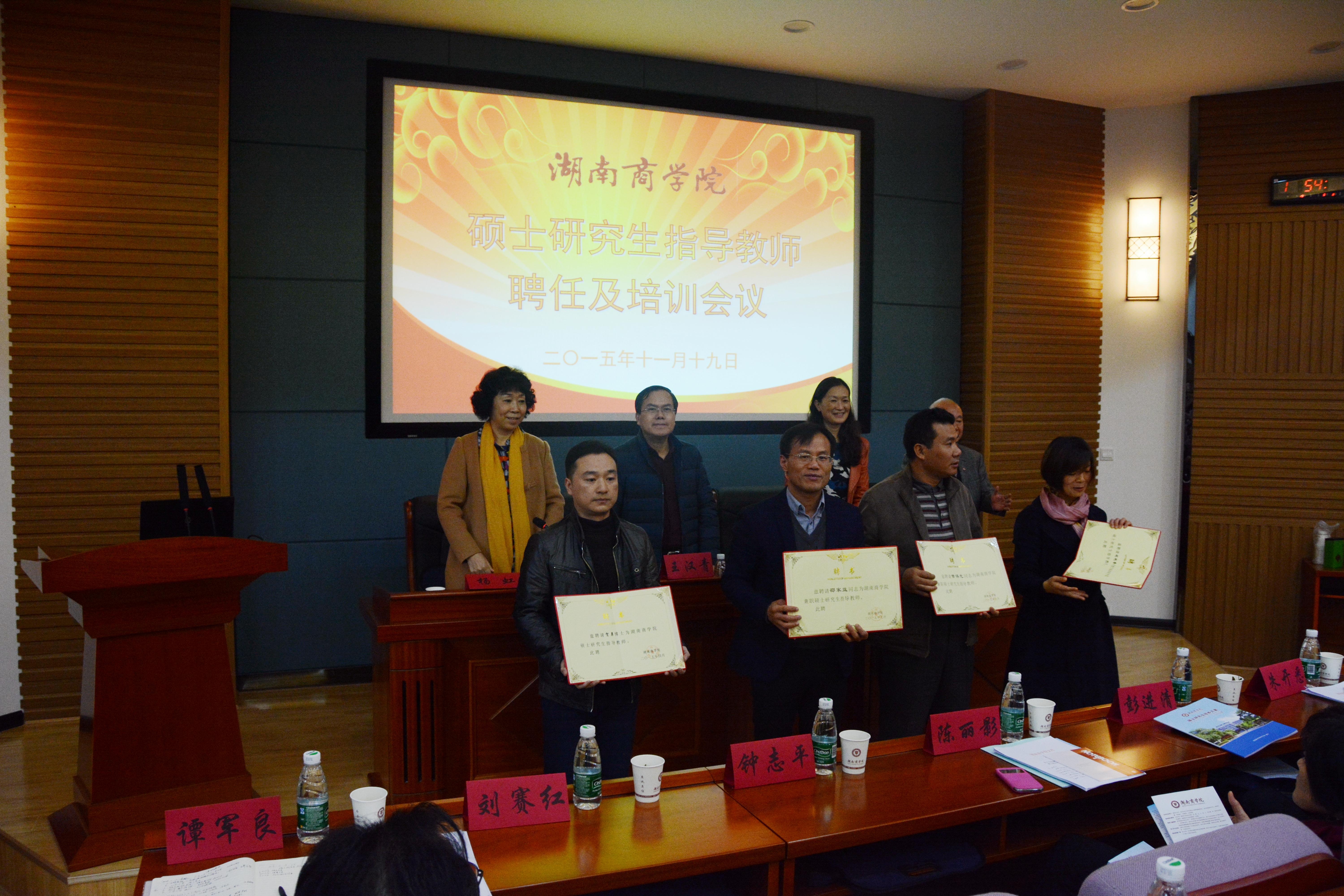 校领导杨虹教授宣读了2014年度、2015年度硕士研究生导师遴选结果的文件和2015年校外兼职硕士研究生指导教师遴选结果的文件。会上,受聘的硕士研究生导师代表上台接受了聘书。