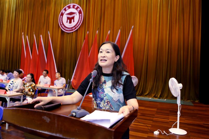 陈晓红校长代表全校师生员工,对全体新同学表示祝贺和欢迎,并简要介绍学校基本情况和办学特色。“在梦想起航的时刻,你们准备怎样度过你们的大学生活,为今后的梦想打好基础呢?”面对近四千名怀揣各种梦想踏入湖商的新同学,陈晓红校长首先发问。“敦品励学”“ 格物致知”“ 致知于行”这是陈校长给新同学们提出的三点建议。她强调,敦品励学就是要修炼品德,勤奋学习;“格物致知”是希望同学们能够保持一种对科学的追求、探索以及创新的精神;“致知于行”是希望同学们在握紧书本的同时,又要放下书本,两耳多闻窗外事,做到经世致用。陈校长在讲话中承诺,未来学校的办学条件和校园环境会越来越好,今后学生的幸福指数会不断提高,学校就是一切为了学生,为了一切的学生。