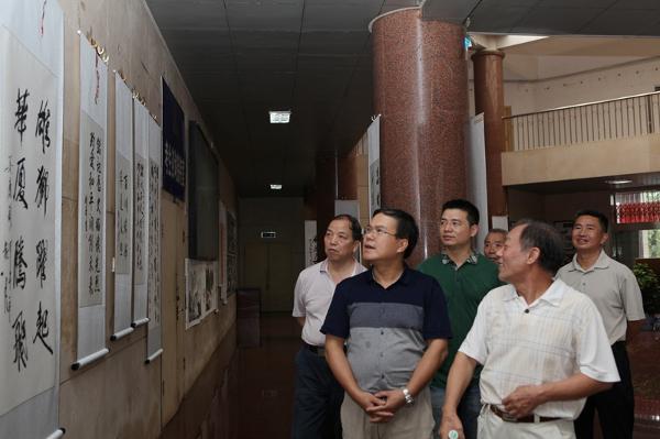 随后,王汉青书记一行仔细观看了展出作品,并与部分创作者进行交流。王汉青书记还应老同志之邀欣然为展览题写展名。