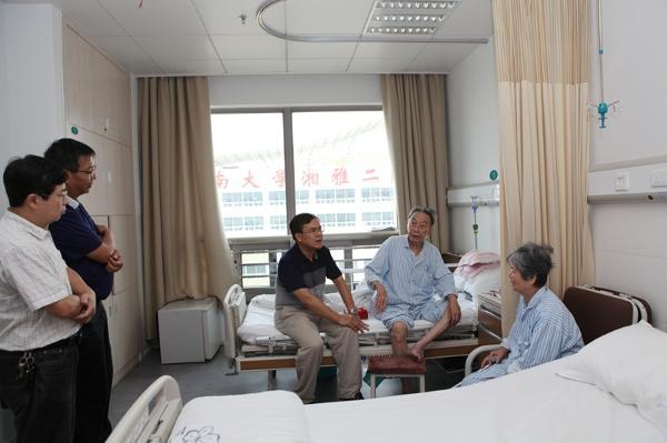 9月2日下午,校党委书记王汉青、党委副书记夏继春一行前往中南大学湘雅附二医院看望慰问抗日战争时期参加革命工作的老同志郭明正,并送上慰问金和中共中央、国务院、中央军委颁发的“中国人民抗日战争胜利70周年纪念章”。王汉青书记代表学校党委对郭老表示慰问,对郭老为我校发展建设做出的重要贡献表示感谢。王汉青书记与郭老促膝长谈,认真倾听他讲述当年的事迹,并仔细询问了郭老的身体状况和饮食起居。王汉青书记表示,学校将传承和弘扬抗战老干部的精神,把学校各项事业发展好,他祝愿老干部们健康长寿、生活幸福、万事如意!(文/图 胡慧美)