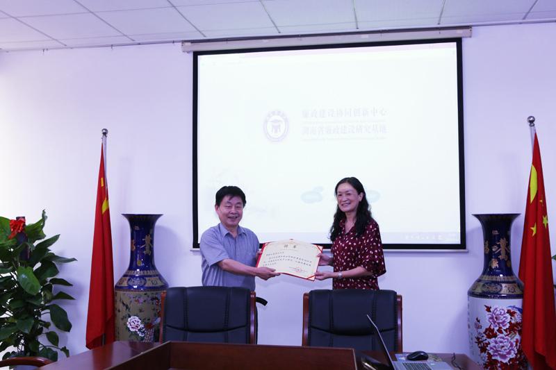 受聘仪式后,葛洪元副主席与王汉青书记、陈晓红校长、王明高教授、陈丽影教授一道为廉政建设协同创新中心揭牌仪式,并一同参观了中心的办公场所,观摩了中心中英文网站的上线演示。