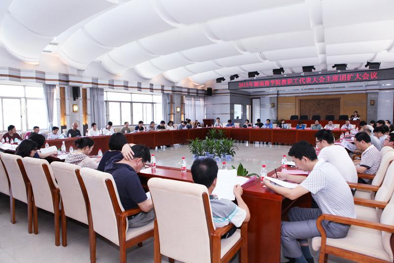 6月24日下午,学校在设计艺术学院综合楼三楼多功能报告厅召开2015年教职工代表大会主席团扩大会议,审议并通过了《湖南商学院章程》。全体校领导出席会议,校党委书记王汉青和校长陈晓红在会上作重要讲话。教代会主席团成员和部分教代会代表参加会议。会议由我校副校级督导员廖明星主持。