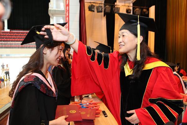 随后,2015届毕业生代表身着学士服,走上主席台,接受校领导为其拨正学士帽流苏,并颁发毕业证、学位证。