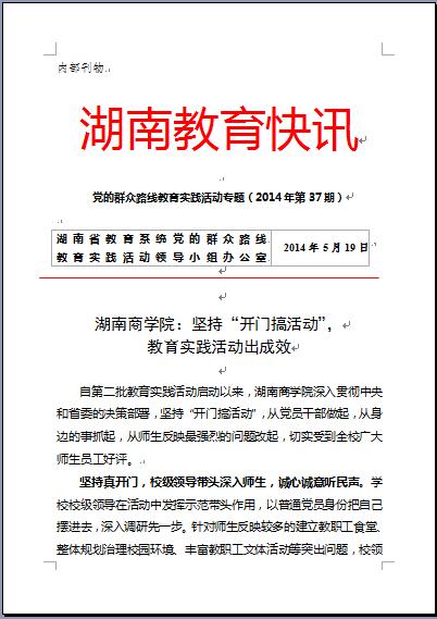 近日,由湖南省教育系统党的群众路线教育实践活动领导小组办公室编印的《湖南教育快讯》,以“湖南商学院:坚持‘开门搞活动’,教育实践活动出成效”为题,从“诚心诚意听民声”、“听取意见全覆盖”、“立行立改求实效”等三个方面,对我校教育实践活动第一环节工作的做法、成效,进行了归纳总结,并以简报形式下发,在全省各高校及相关部门中推广交流,简报内容如下: