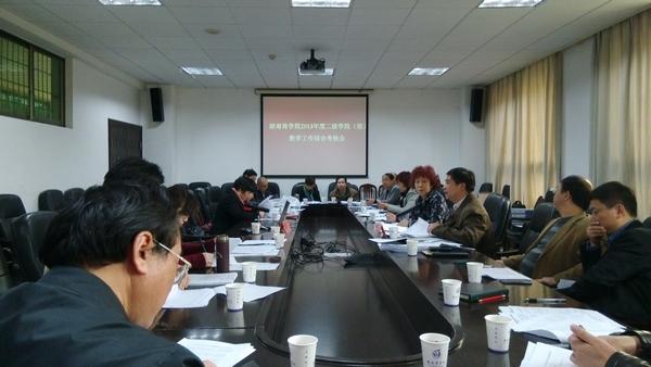 本次会议根据《湖南商学院二级学院(部)教学工作综合考核实施办法》(校行发〔2010〕55号)文件精神,只对A类指标项目进行考核。A类指标主要从领导班子的教学管理工作及水平、导师工作、教学研究与改革活动、教学质量保障体系、教学工作特色五个方面考核二级学院(部)的教学工作质量与管理业绩,其权重为0.3。除A类指标的考核外,综合考核还包括B类指标考核。B类指标主要考核教学工作中可量化记分项目的绩效,权重为0.7。目前,教务处、评建办已在2014年初已经完成B类指标项目评分。