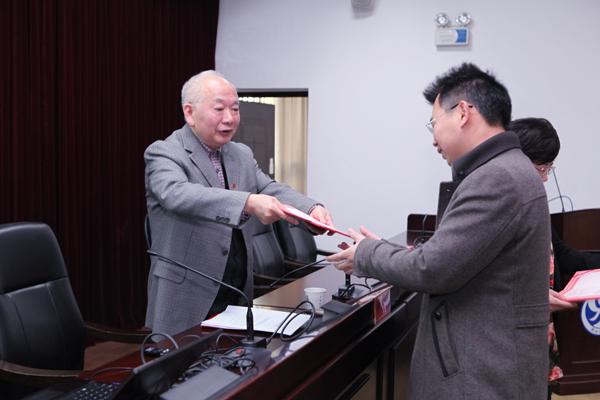 副校长王明高在会上宣读《关于公布湖南商学院2013年硕士研究生指导教师遴选结果的通知》。校长唐未兵、校一级荣誉教授柳思维为研究生导师颁发聘书。