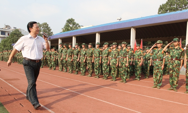 历经了烈日的考验,历经了风雨的洗礼,2011级新生喊着响亮的口号,迈着整齐的步伐依次从主席台前走过,接受检阅。9月14日下午,我校2011级新生军训阅兵式暨总结表彰大会在体育场隆重举行。校长唐未兵,副校长杨虹、曾伏秋出席了阅兵式,国防科技大学指挥军官基础教育学院陈跃能大校、欧德稳大校、邓崇顺少校,武警湖南省消防总队培训基地刘林中校应邀参加了大会。参加大会的还有我校各职能部门负责人及各二级学院负责人。