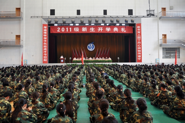 上午9时整,开学典礼在雄壮的国歌声中正式开始。唐未兵校长在典礼上发表了讲话。他对2011级新生的到来表示欢迎并简要介绍了我校的基本情况。他借用老舍先生的话勉励全体新生,&“人生最值得纪念的是‘大学生活’那一段&”,大学的岁月将会是大家一生中最宝贵、最美好、最难忘的时光,也将为未来奠定基石、谱写基调。 同时,唐未兵校长对新生们大学期间的学习和生活提出了几点希望:一是涵养德行,砥砺品质;二是远离浮躁,潜心求学;三是崇能尚行,投身实践;四是融入集体,彰显自我。他号召同学们秉承&“厚德、博学、精明、自强&”的校训,惜时勤勉,刻苦学习,锐意进取,奋发有为,书写人生的崭新篇章,努力成为祖国的栋梁之才!