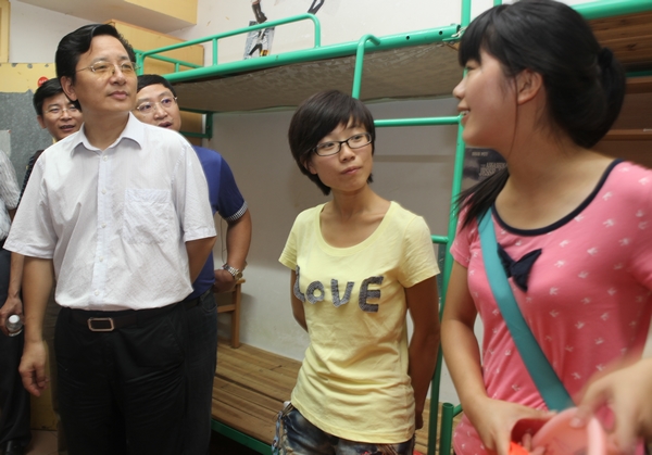 在贤德公寓新生宿舍,唐未兵走进寝室与新生亲切交谈,&“同学们,欢迎你们来到湖南商学院学习深造!&”突然看见这么多关切、和蔼的面孔,同学们脸上掠过一丝惊讶,得知是校领导来看望自己时,他们都十分激动。唐未兵校长叮嘱同学们要尽快适应大学新环境,刻苦学习,努力实现人生的新目标,同时也要学会照顾好自己,有什么困难要及时向老师反映,学校会尽力帮助解决。当了解到来自保险专业的新生胡同学,因为一米九五的身高需要更换寝室床铺时,唐未兵校长特别嘱咐宿管部门人员尽快解决,并请家长放心。