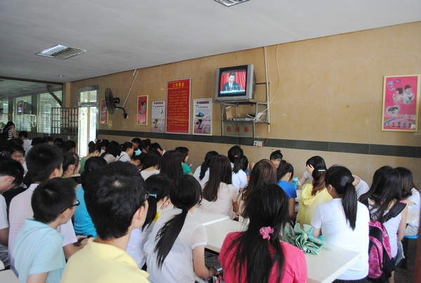上午10点,校领导欧阳峣、唐未兵、夏继春、李泽华、彭进清、杨虹、王明高、曾伏秋、陈丽影、廖明星、刘国权以及各职能部门负责人,在二办公楼702会议室准时收看了&“庆祝中国共产党成立90周年大会&”电视直播。与此同时,来自各个学院的数千名学生分别在大礼堂、一食堂、二食堂、三食堂集中收听收看了大会实况。此外,许多学生还通过寝室网络直播收看庆祝大会。法学院09级学生王凯说:&“听了总书记回顾中国共产党九十年的风雨历程和中国共产党带领中国人民取得的辉煌成就,让我深切地感受到我们今天的幸福来之不易。作为当代大学生,我们要铭记党恩,珍惜大学生活,为祖国的美好明天不懈奋斗。&”