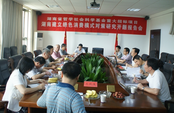 6月27日上午,唐未兵教授主持的湖南省哲学社会科学基金重大招标项目——《湖南建立绿色消费模式对策研究》开题报告会在二办公楼702会议室举行。报告会由省哲学社会科学规划基金办公室主任骆辉主持,省政府经济研究信息中心贝兴亚研究员、湖南师范大学马伯钧教授、长沙理工大学刘解龙教授、湖南大学李斌教授、我校学术委员会主任柳思维教授等专家组成员,及省哲学社会科学规划基金办公室副主任王礼生出席了报告会。