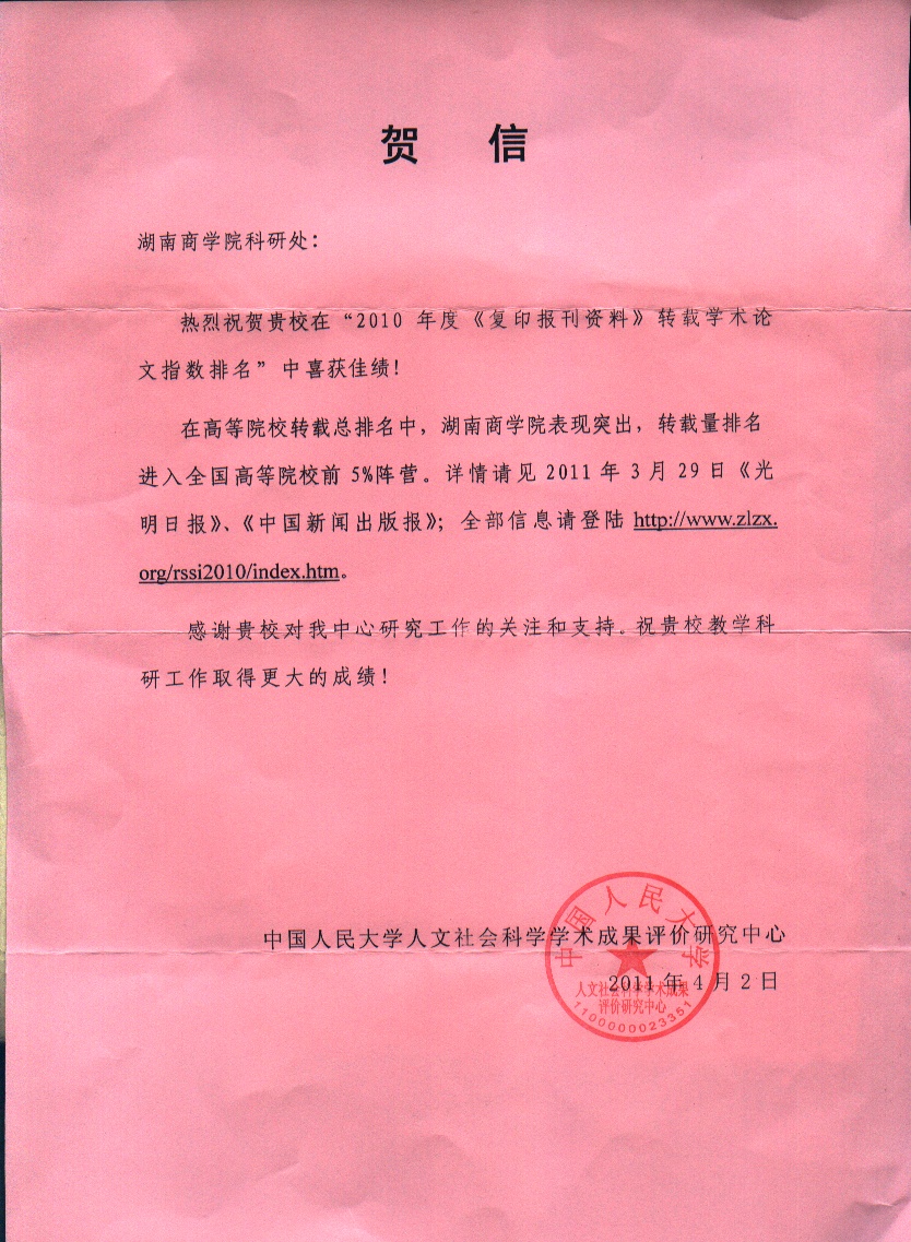 日前,我校收到中国人民大学人文社会科学学术成果评价研究中心的贺信,祝贺我校在&“2010年度《复印报刊资料》转载学术论文指数排名&”中喜获佳绩。贺信写道:在高等院校转载总排名中,湖南商学院表现突出,转载量排名进入全国高等院校前5%阵营。